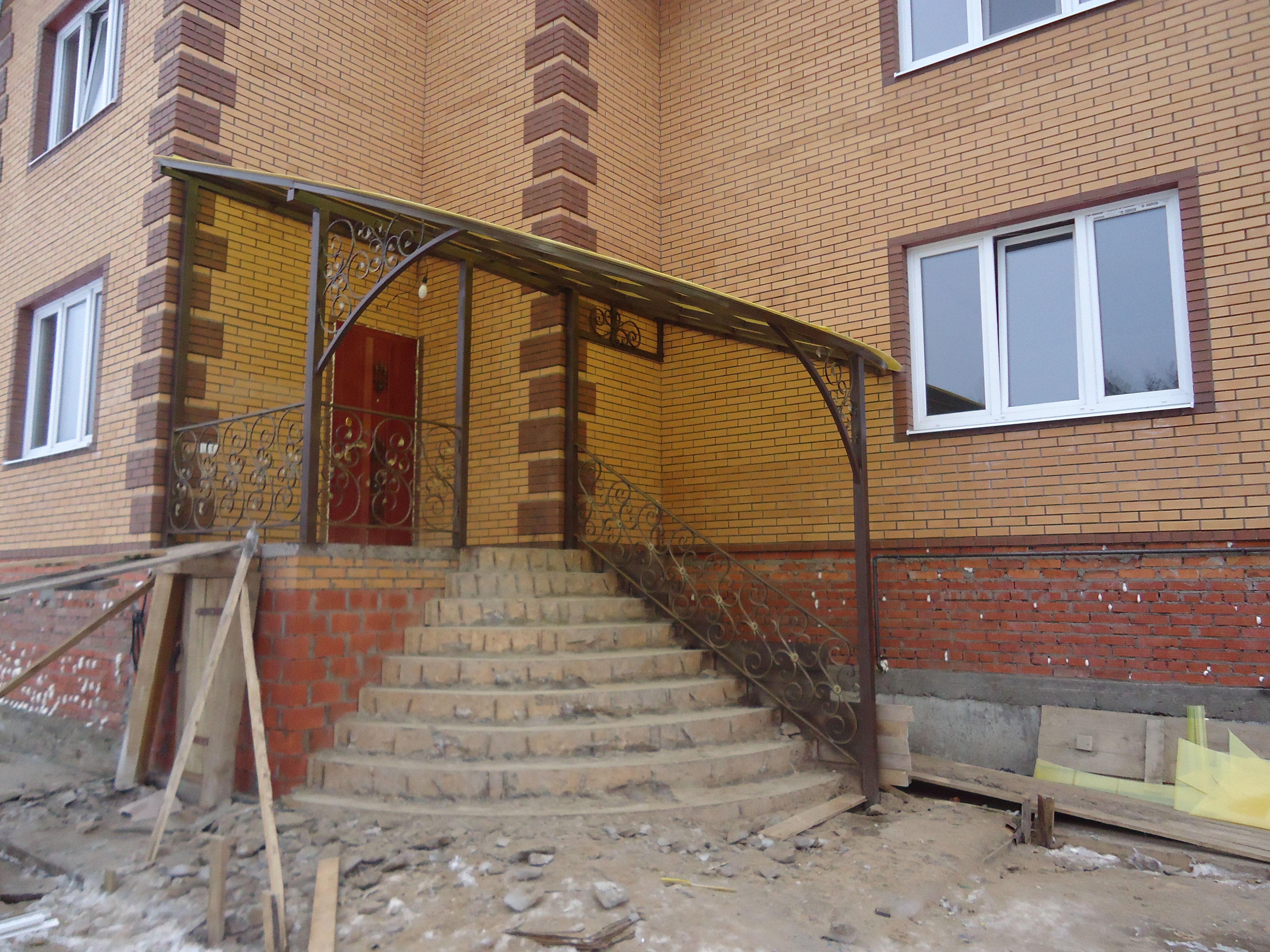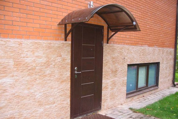Сегодня очень часто встречаются козырьки из поликарбоната. Они имеют привлекательный внешний вид и могут вписаться в практически любой дизайн, за счет малого веса поликарбоната стены и конструкции постройки не оказываются существенные нагрузки.